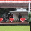 Puan terlihat mengenakan kaus merah dengan jaket sporty hitam dan sepatu kets saat menanam bibit jagung memakai alat tanam khusus.